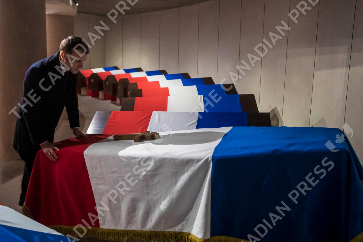 French President Emmanuel Macron pays tribute to the flag draped coffins in the crypt of the French resistance memorial of the Mont Valerien during a ceremony for Hubert Germain, a WWII veteran and the last "Companion of the Liberation," in Suresnes, near Paris, Thursday, Nov. 11, 2021. Germain recently died at age 101. (Christophe Petit Tesson/Pool Photo via AP)