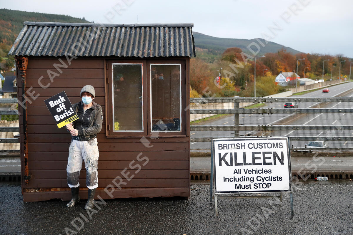 Border Communities Against Brexit stage a protest at Carrickcarnon, Ireland, Saturday, Saturday, Nov. 20, 2021. Five demonstrations were held in various locations on the border Saturday oppose a threat by the British Government to trigger Article 16. Another week of Brexit negotiations still left the European Union awaiting a firm counterproposal from the United Kingdom on Friday to ease a standoff over how to deal with the country's departure from the bloc. Both sides are fighting over differences in how to regulate trade in Northern Ireland. (AP Photo/Peter Morrison)