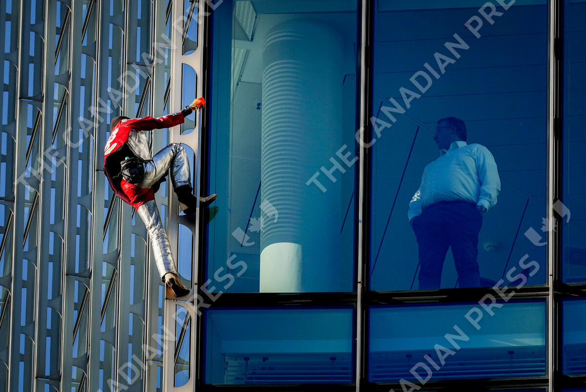 French urban climber Alain Robert climbs up the Skyper high-rise building in central Frankfurt, Germany, as a man watches from his office, Tuesday, Nov. 23, 2021. (AP Photo/Michael Probst)