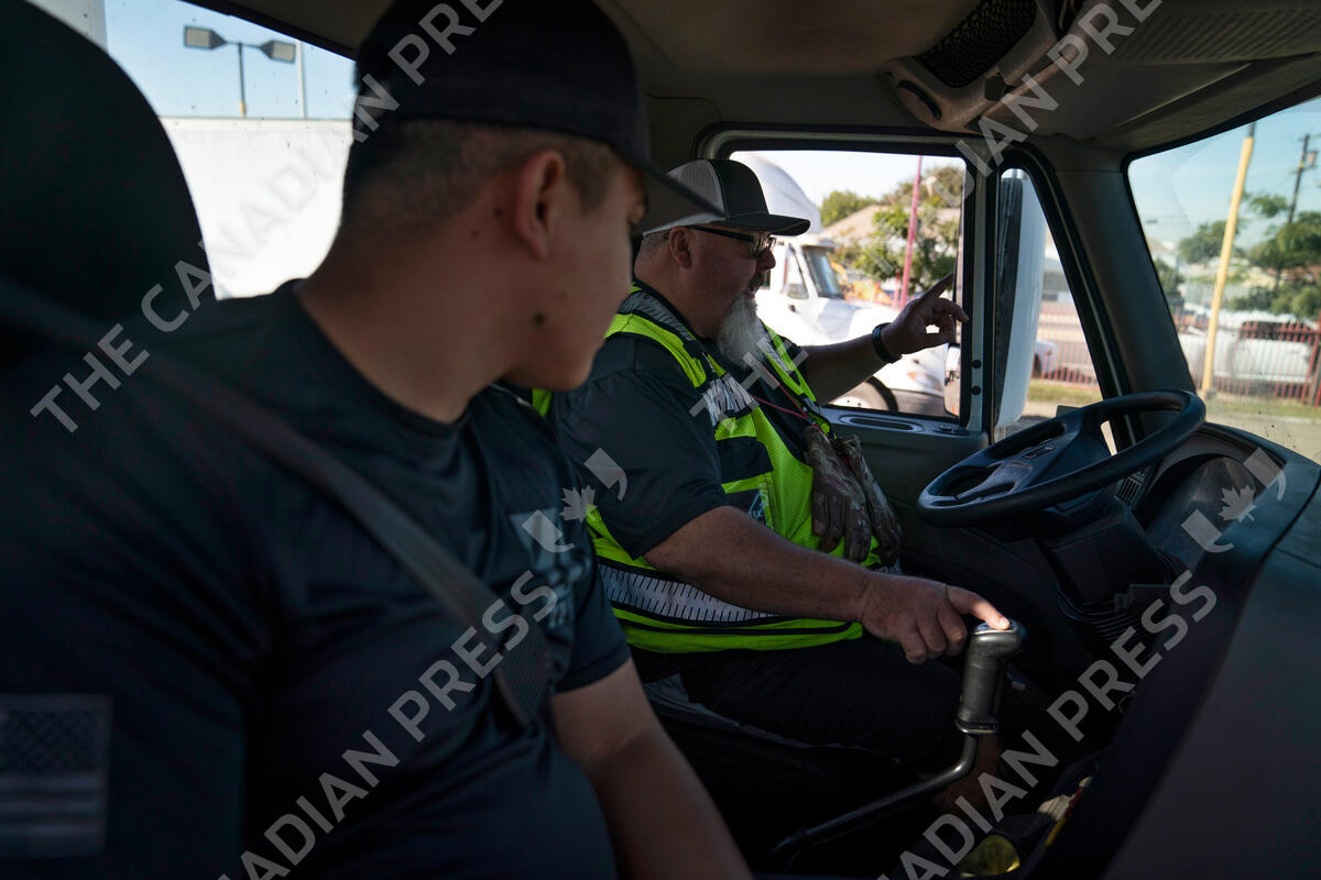 Student driver Luis Barrientos, foreground, listens to instructor Daniel Osborne while sitting in a practice truck at California Truck Driving Academy in Inglewood, Calif., Monday, Nov. 15, 2021. Amid a shortage of commercial truck drivers across the U.S., a Southern California truck driving school sees an unprecedented increase in enrollment numbers. The increase is big enough that the school is starting an evening class to meet the demand, according to Tina Singh, owner and academy director of California Truck Driving Academy. "I think that's only going to continue because there's a lot of job opportunities. We have over 100 active jobs on our job board right now," said Singh. The companies that normally would not hire drivers straight out of school are "100 percent" willing to hire them due to shortage issues, the director added. (AP Photo/Jae C. Hong)