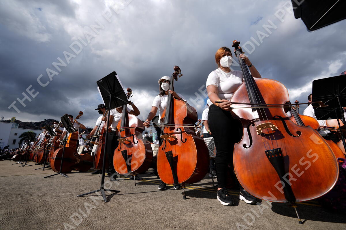 Members of the National Orchestra System gather to try and break a Guinness World Record for most instruments used in a piece of music, in Caracas, Venezuela, Saturday, Nov. 13, 2021. The musicians, all connected with the country's network of youth orchestras, will play a 12-minute Tchaikovsky piece at a military base under the watchful eyes of hundreds of independent supervisors tasked with verifying that more than 8,097 instruments are played at the same time. (AP Photo/Ariana Cubillos)