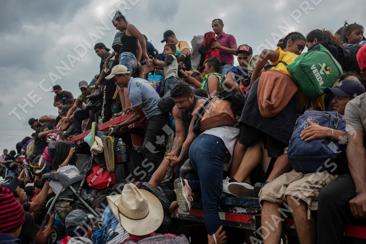 Migrants help fellow migrants onto the bed of a trailer in Jesus Carranza, in the Mexican state of Veracruz, Wednesday, Nov. 17, 2021. A group of mainly Central American migrants are attempting to reach the U.S.-Mexico border. (AP Photo/Felix Marquez)
