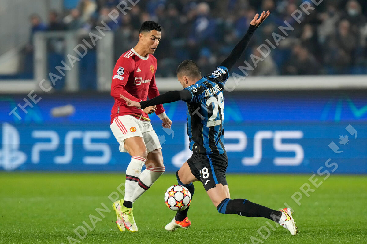 Manchester United's Cristiano Ronaldo dribbles the ball past Atalanta's Merih Demiral, right, during the Champions League group F soccer match between Atalanta and Manchester United, at the Stadio di Bergamo, in Bergamo, Italy, Tuesday, Nov. 2, 2021. (AP Photo/Luca Bruno)