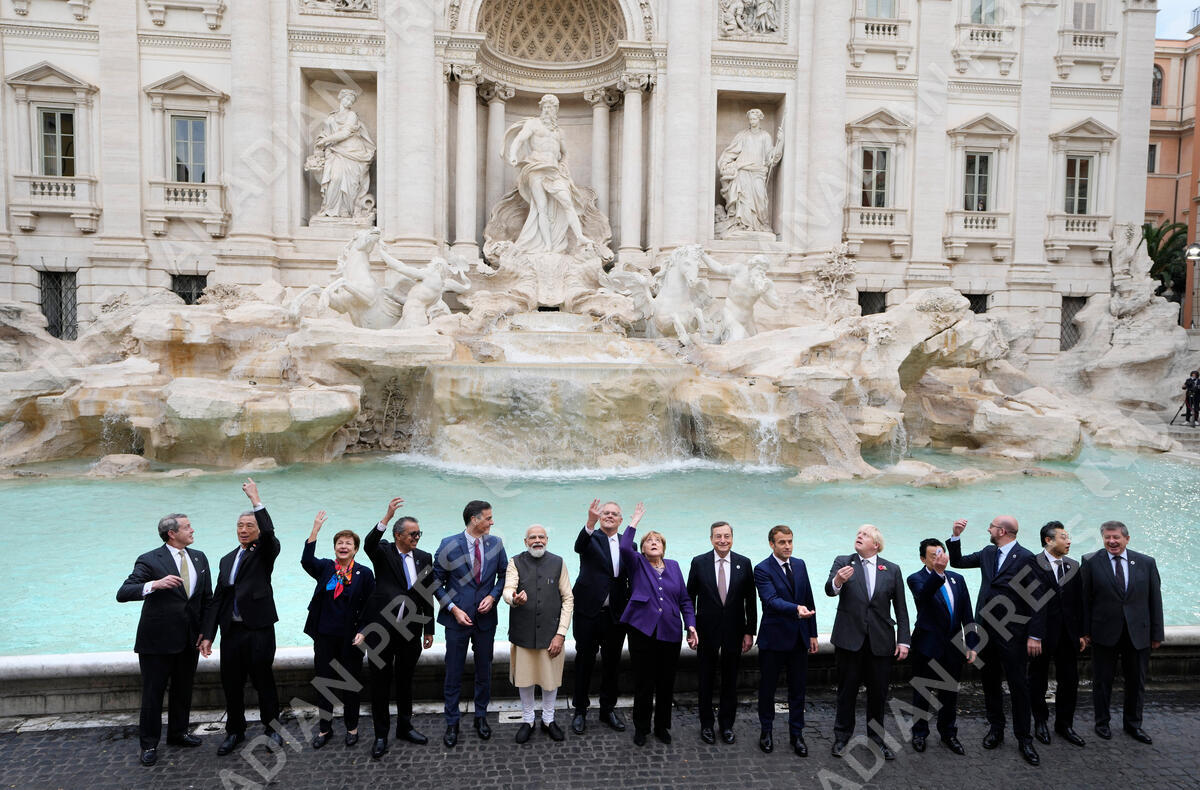 Leaders of the G20 pose in front of the during Trevi Fountain during an event for the G20 summit in Rome, Sunday, Oct. 31, 2021. The two-day Group of 20 summit concludes on Sunday, the first in-person gathering of leaders of the world's biggest economies since the COVID-19 pandemic started. (AP Photo/Gregorio Borgia)