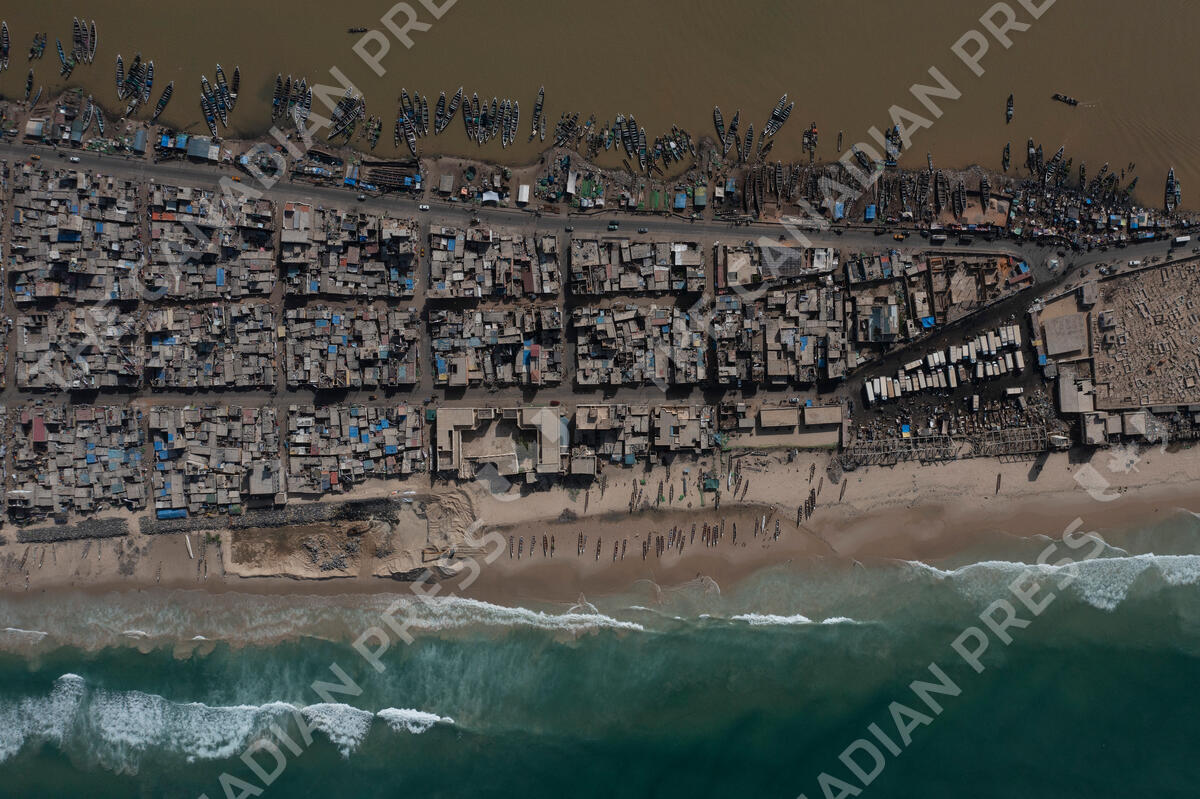In this drone image, houses lay between the Senegal river, top, and the Atlantic Ocean beach that has been affected by erosion in Saint Louis, Senegal, Wednesday, Nov. 3, 2021. World leaders are gathered in Scotland at a United Nations climate summit, known as COP26, to push nations to ratchet up their efforts to curb climate change. Experts say the amount of energy unleashed by planetary warming would melt much of the planet's ice, raise global sea levels and greatly increase the likelihood and extreme weather events. (AP Photo/Leo Correa)