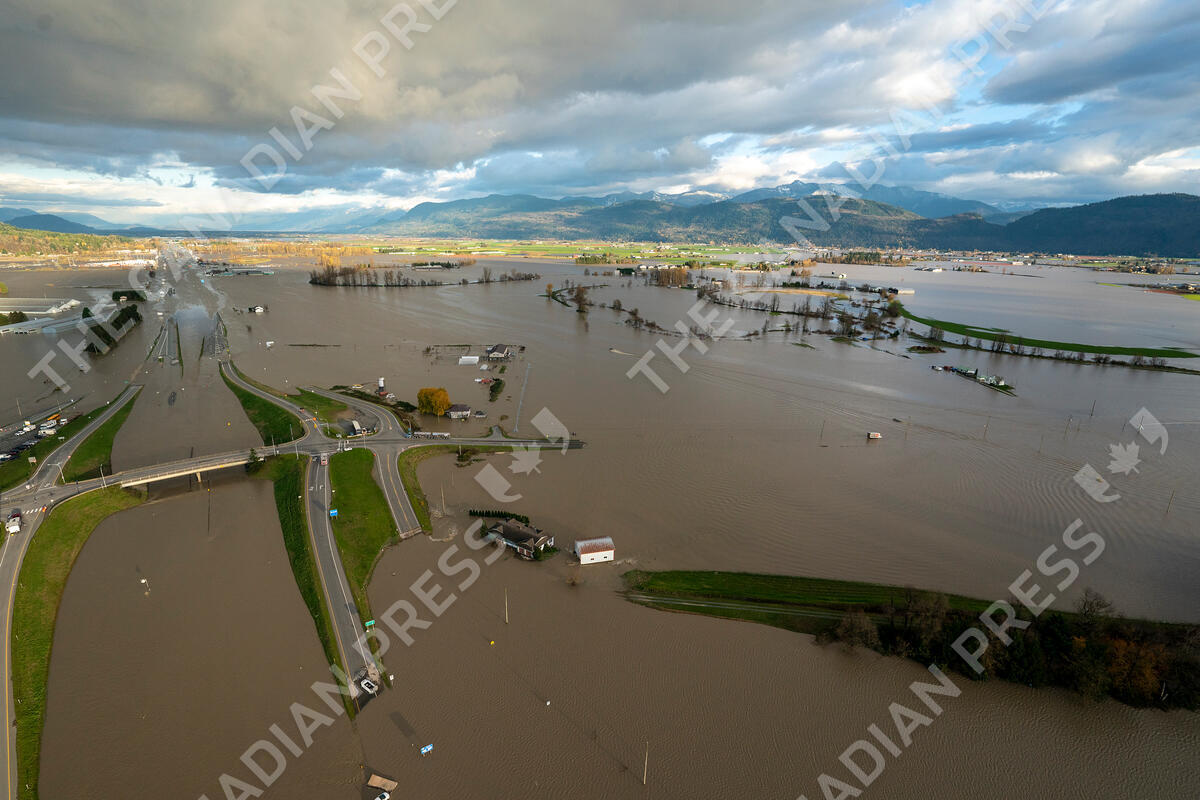 Flood waters cover highway 1 in Abbotsford, B.C., Tuesday, Nov. 16, 2021. THE CANADIAN PRESS/Jonathan Hayward