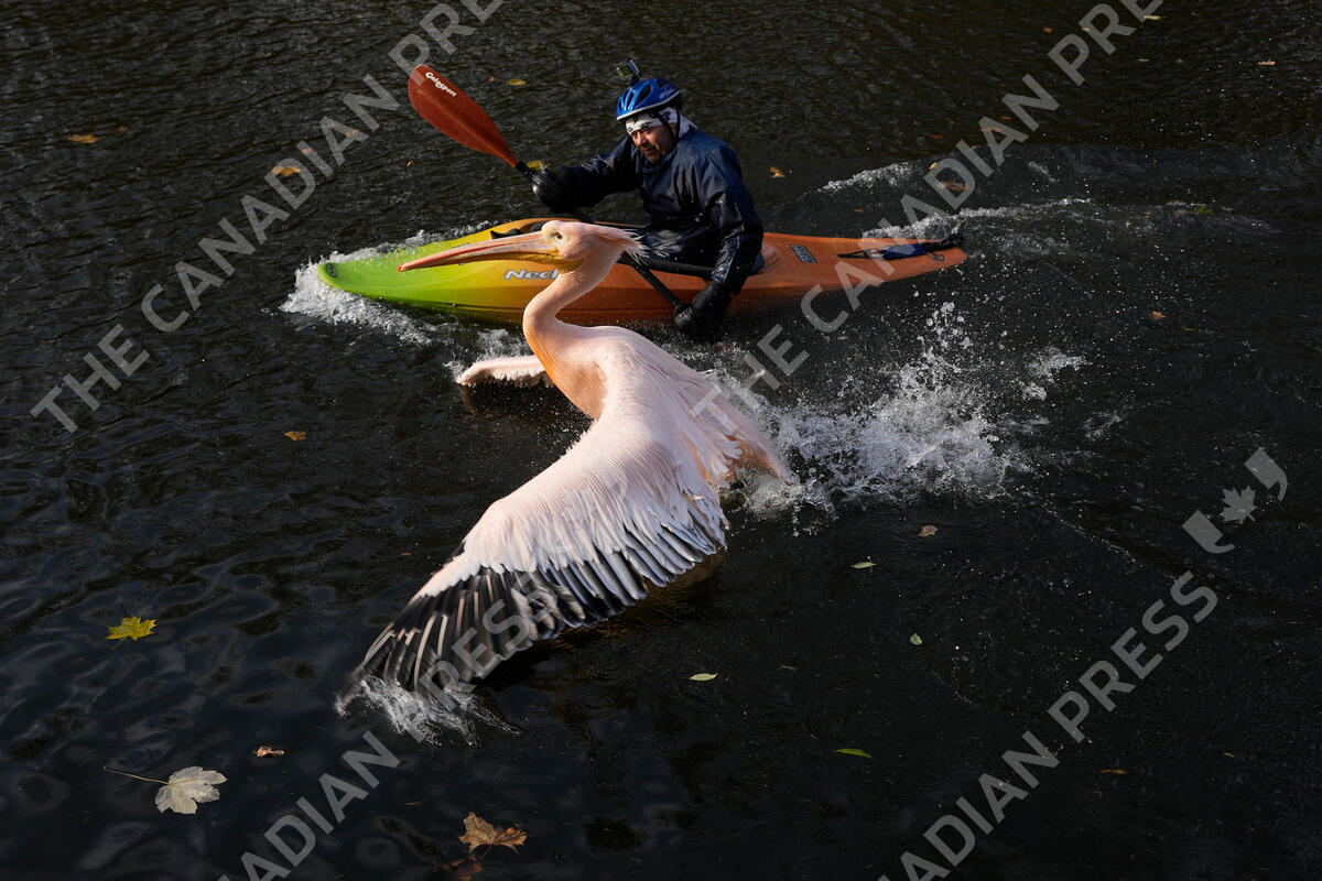 A zoo curator using a kayak tries to catch a pelican in order to move him into its winter enclosure at the zoo in Liberec, Czech Republic, Tuesday, Nov. 16, 2021. (AP Photo/Petr David Josek)