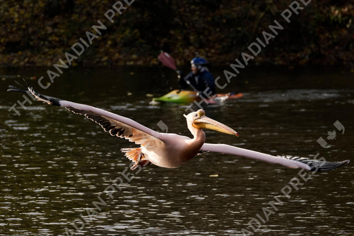 A zoo curator using a kayak tries to catch a pelican in order to move it into its winter enclosure at the zoo in Liberec, Czech Republic, Tuesday, Nov. 16, 2021. (AP Photo/Petr David Josek)