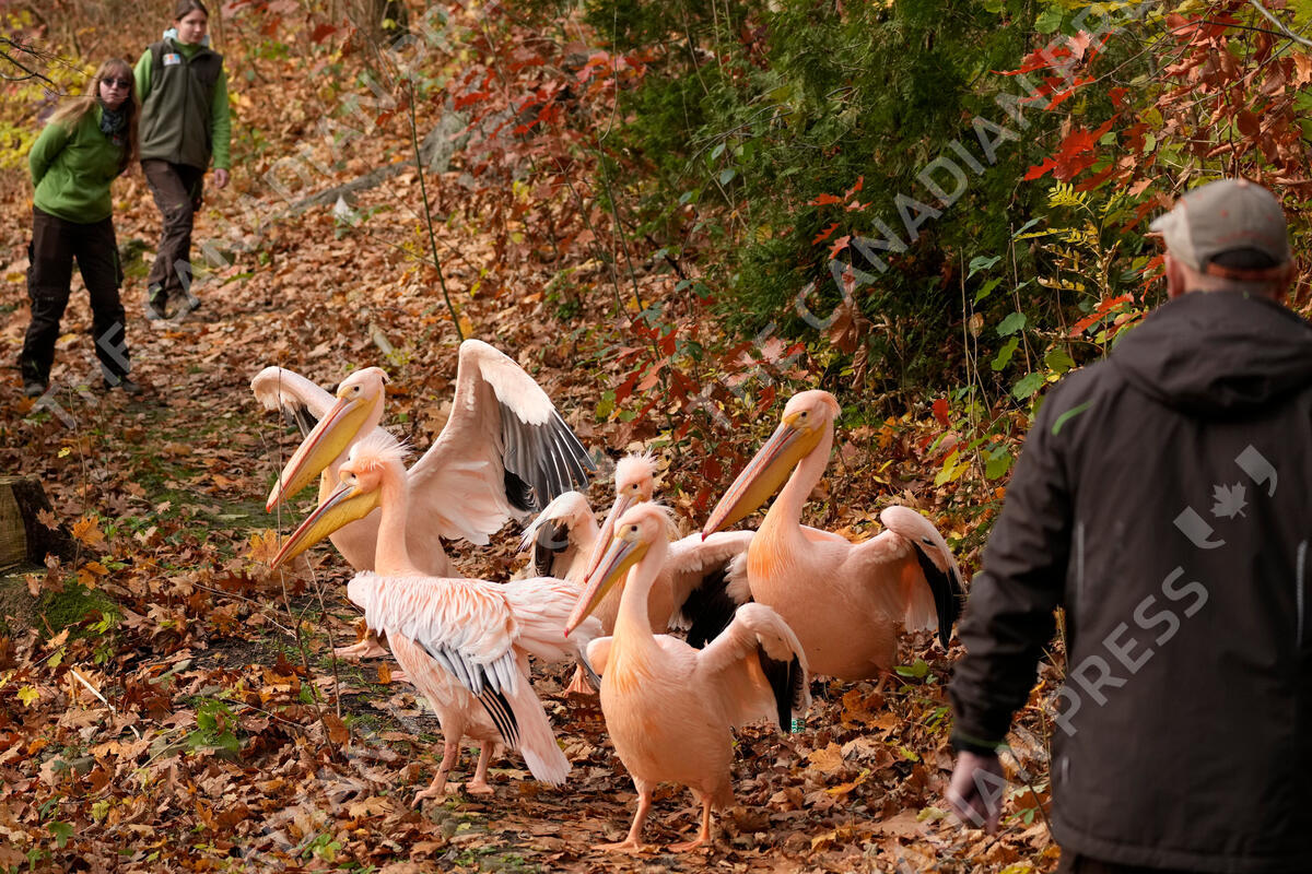 Zoo curators try to catch pelicans in order to move them into their winter enclosure at the zoo in Liberec, Czech Republic, Tuesday, Nov. 16, 2021. (AP Photo/Petr David Josek)
