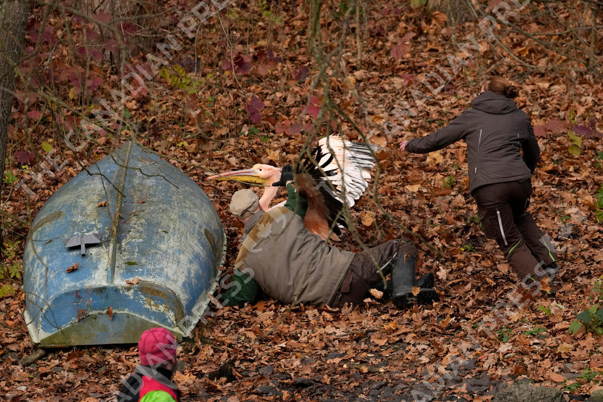 Zoo curators try to catch a pelican in order to move him into its winter enclosure at the zoo in Liberec, Czech Republic, Tuesday, Nov. 16, 2021. (AP Photo/Petr David Josek)