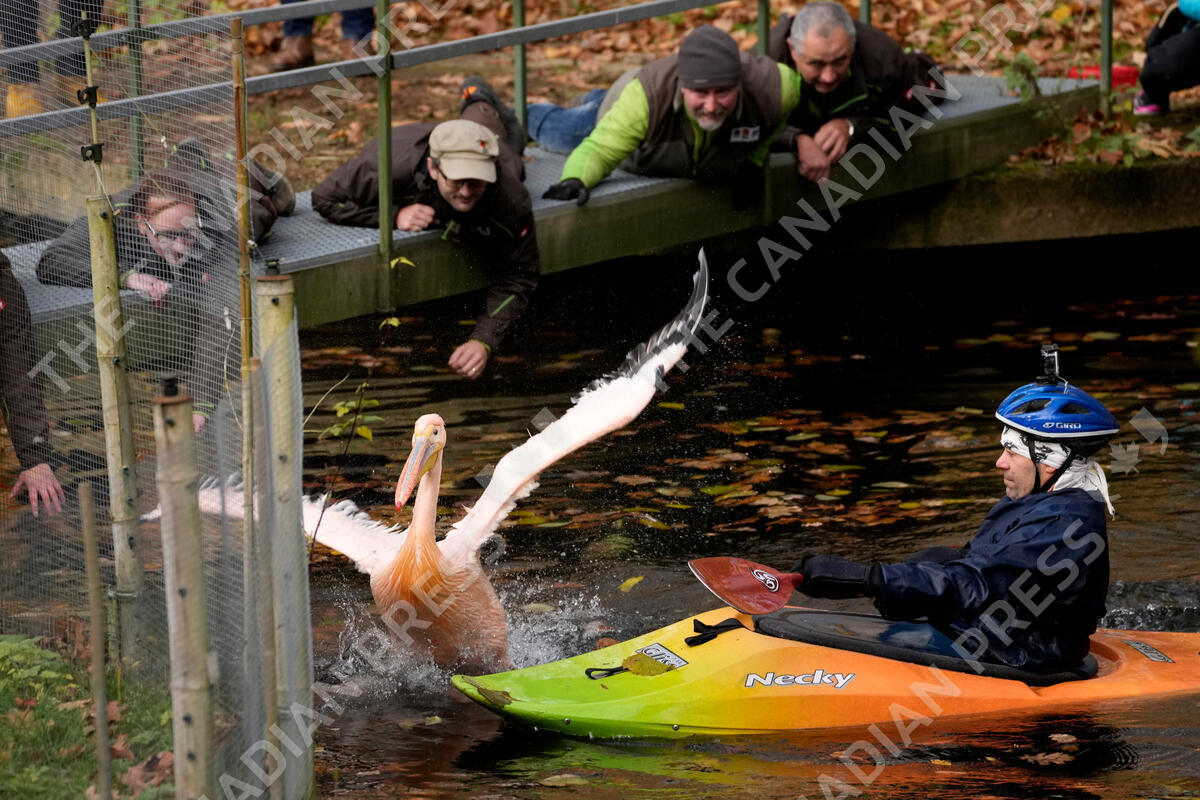 Zoo curators try to catch a pelican in order to move it into its winter enclosure at the zoo in Liberec, Czech Republic, Tuesday, Nov. 16, 2021. (AP Photo/Petr David Josek)