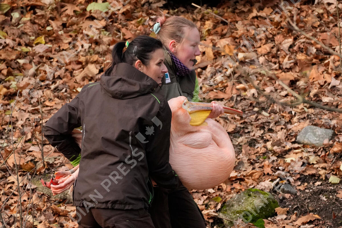 Zoo curators carry a pelican to its winter enclosure at the zoo in Liberec, Czech Republic, Tuesday, Nov. 16, 2021. (AP Photo/Petr David Josek)