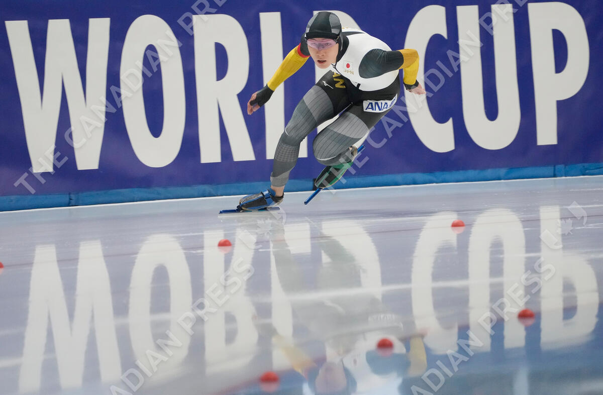 Wataru Morishige of Japan in action during the man's 2nd 500m race at the Speed Skating World Cup in Tomaszow Mazowiecki, Poland, Sunday, Nov. 14, 2021. (AP Photo/Czarek Sokolowski)