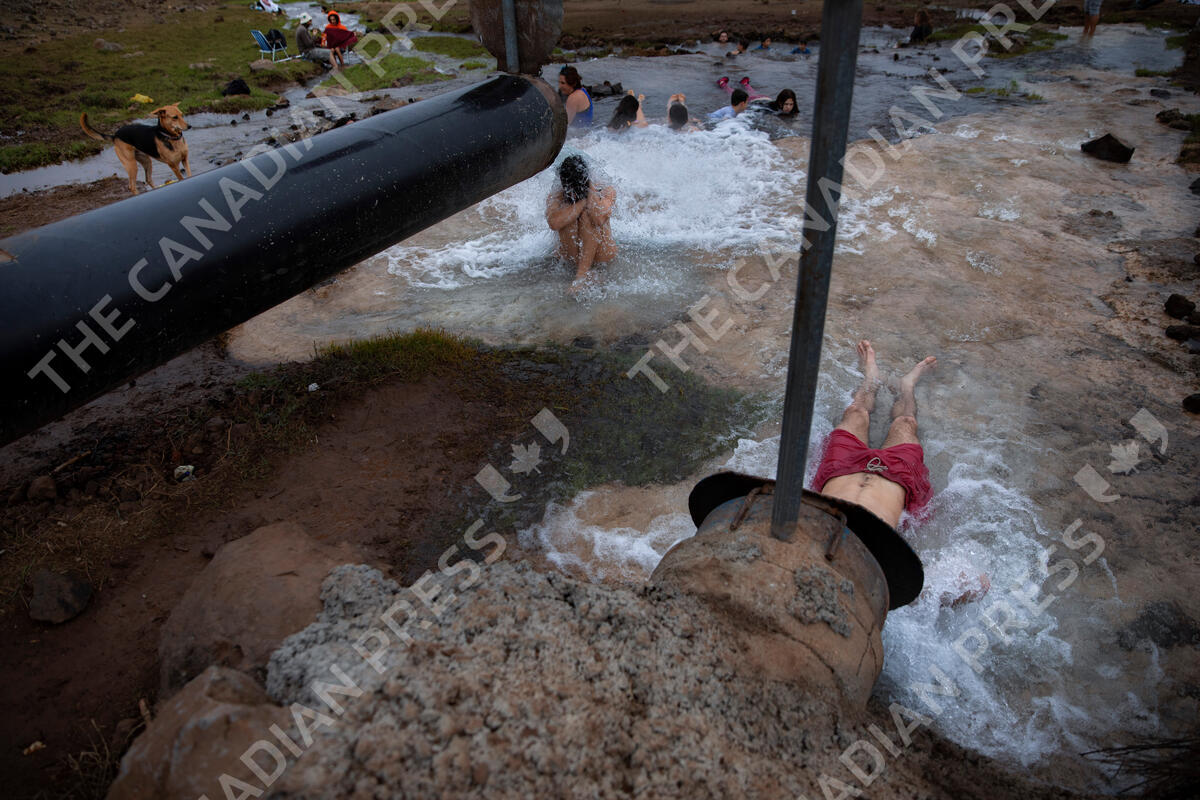 Israelis bathe in hot water coming out from a pipe at a reservoir near Mount Bental in the Israeli-controlled Golan Heights, Saturday, Dec. 4, 2021. (AP Photo/Oded Balilty)