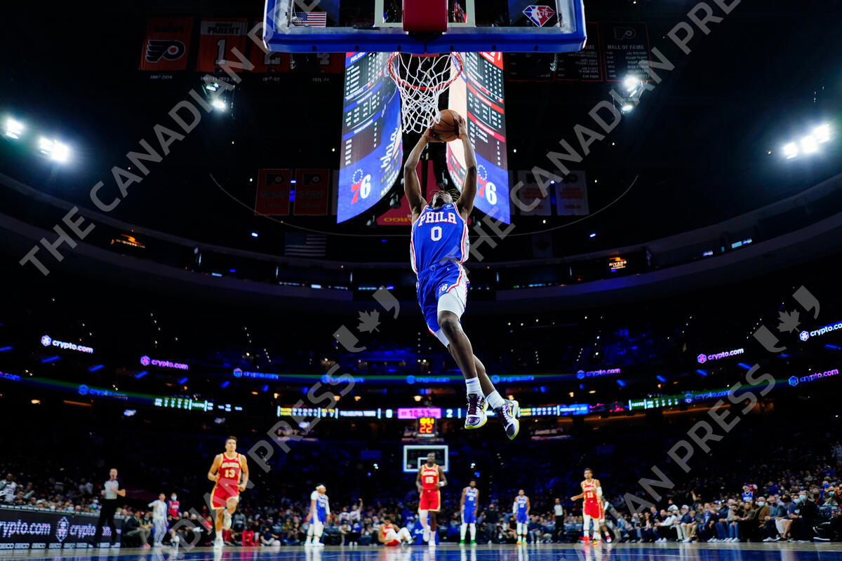 Philadelphia 76ers' Tyrese Maxey goes up for a dunk during the first half of an NBA basketball game against the Atlanta Hawks, Saturday, Oct. 30, 2021, in Philadelphia. (AP Photo/Matt Slocum)