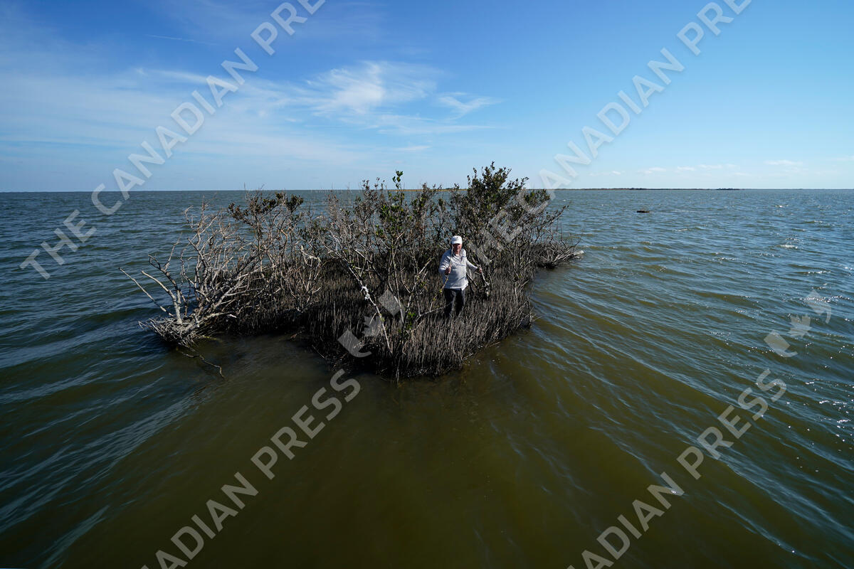 PJ Hahn, an environmental consultant and former Plaquemines Parish coastal zone manager, poses for a photo on a small patch of land with mangroves, which is all that remains after the land around it eroded away, in Plaquemines Parish, La., Wednesday, Nov. 3, 2021. World leaders are gathered in Scotland at a United Nations climate summit, known as COP26, to push nations to ratchet up their efforts to curb climate change. Experts say the amount of energy unleashed by planetary warming would melt much of the planet's ice, raise global sea levels and greatly increase the likelihood and extreme weather events. (AP Photo/Gerald Herbert)