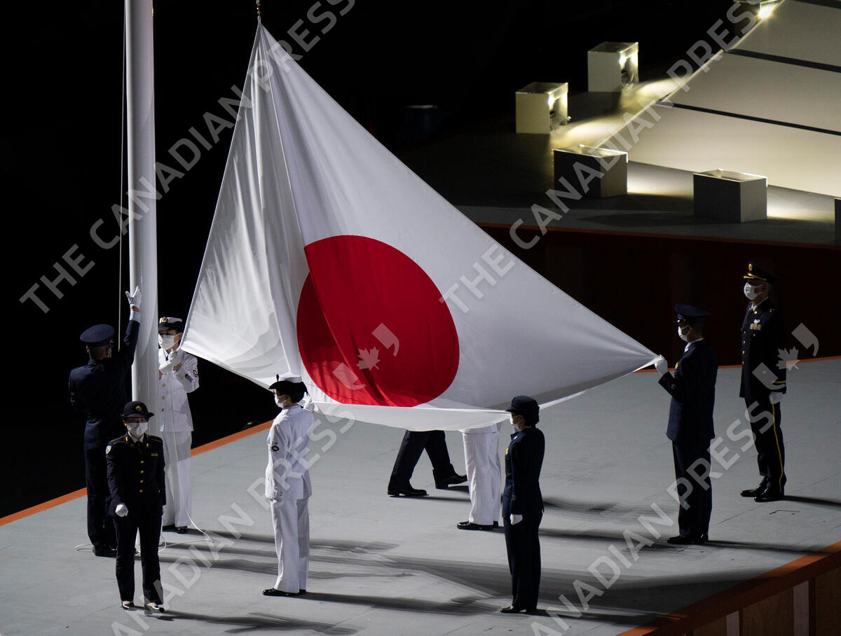 The Japanese flag is raised during the opening ceremonies during the Tokyo Olympics in Tokyo, Japan on Friday, July 23, 2021. THE CANADIAN PRESS/Adrian Wyld