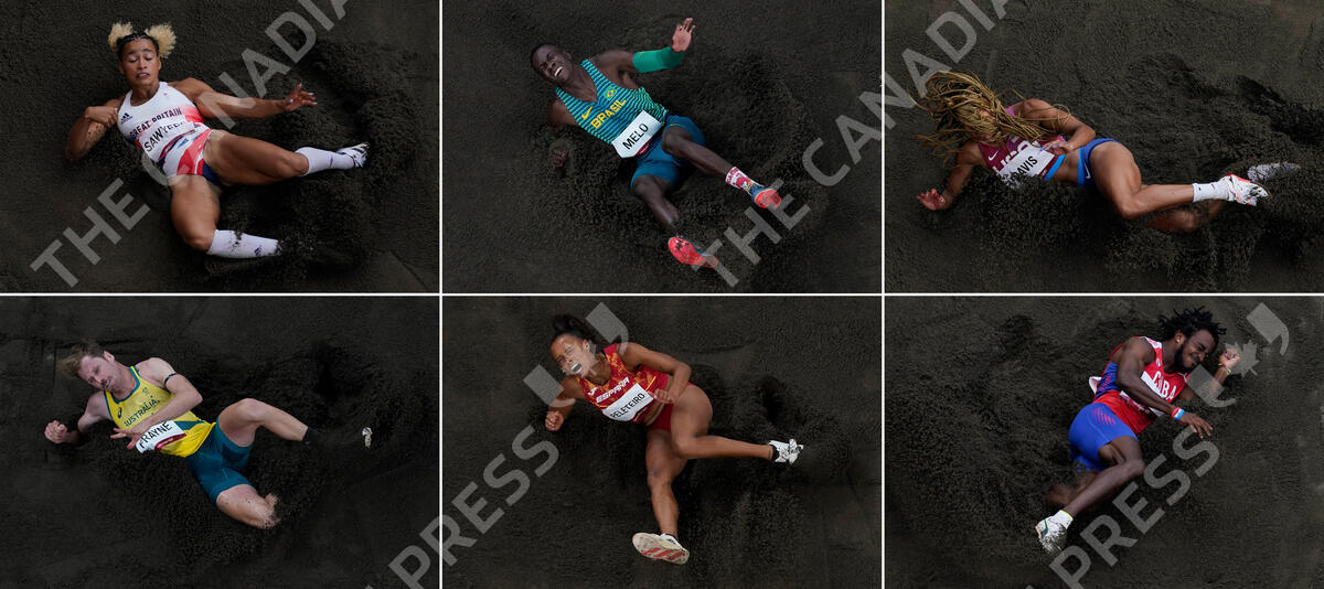 Jumpers, from top left, Jazmin Sawyers, of Britain, Alexsandro Melo, of Brazil, Tara Davis, of United States, Henry Frayne, of Australia, Ana Peleteiro, of Spain, and Maykel Masso, of Cuba, compete at the 2020 Summer Olympics in Tokyo. (AP Photos/Morry Gash)