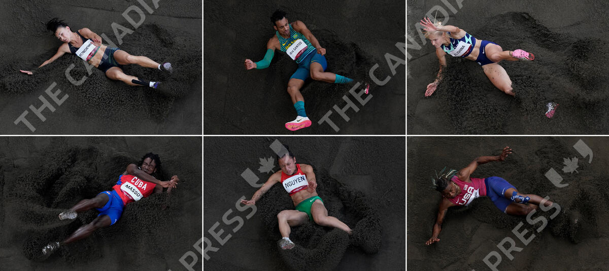 Jumpers, from top left, Darya Reznichenko, of Uzbekistan, Almir Dos Santos, of Brazil, Darya Klishina, of the Russian Olympic Committee, Maykel Masso, of Cuba, Anasztazia Nguyen, of Hungary, and Juvaughn Harrison, of United States, compete at the 2020 Summer Olympics in Tokyo. (AP Photos/Morry Gash)