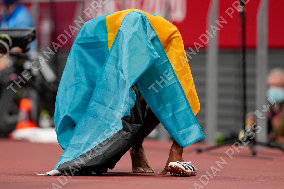 Steven Gardiner, of the Bahamas, reacts after winning the men's 400-meter final at the 2020 Summer Olympics, Thursday, Aug. 5, 2021, in Tokyo. (AP Photo/Petr David Josek)