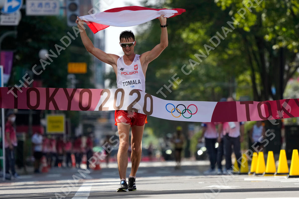 Dawid Tomala, of Poland, celebrates after placing first in the men's 50km race walk at the 2020 Summer Olympics, Friday, Aug. 6, 2021, in Sapporo, Japan. (AP Photo/Shuji Kajiyama)