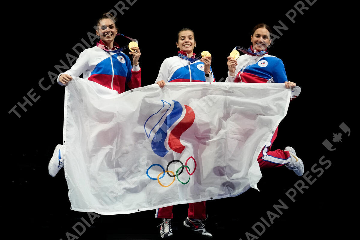 Gold medalists of the Russian Olympic committee Sabre team celebrate on the podium during the medal ceremony for the women's Sabre team final medal competition at the 2020 Summer Olympics, Saturday, July 31, 2021, in Chiba, Japan. (AP Photo/Hassan Ammar)