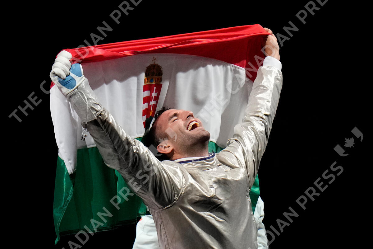 Aron Szilagyi of Hungary celebrates winning the gold medal after defeating Luigi Samele of Italy compete in the men's individual final Sabre competition at the 2020 Summer Olympics, Saturday, July 24, 2021, in Chiba, Japan. (AP Photo/Hassan Ammar)