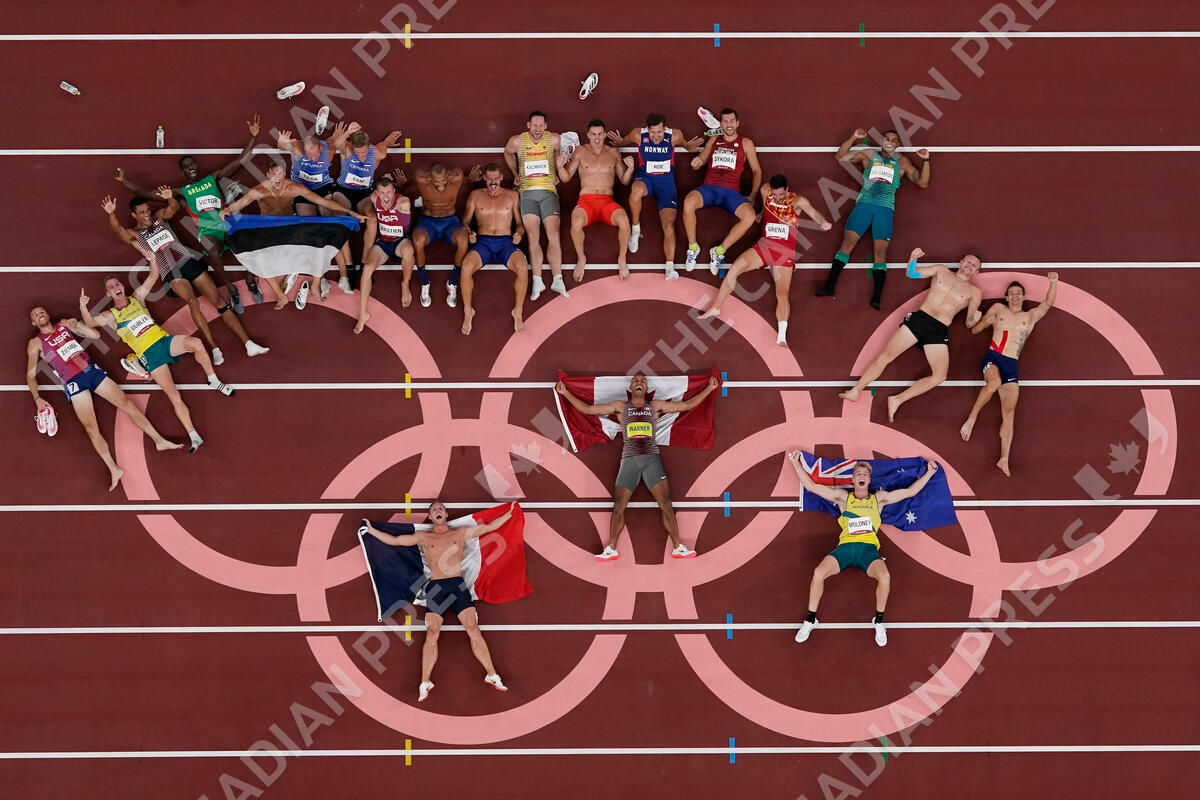 The athletes from the men's decathlon pose for a picture on the Olympic rings at the 2020 Summer Olympics, Thursday, Aug. 5, 2021, in Tokyo. (AP Photo/Morry Gash)