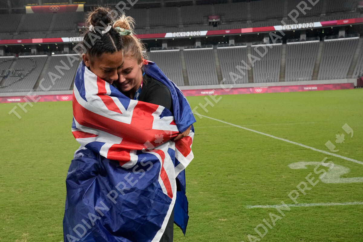 New Zealand's Risi Pouri-Lane, left, and Michaela Blyde hug, wrapped in a national flag, as they celebrate in the empty stadium after receiving their gold medals in women's rugby sevens at the 2020 Summer Olympics, Saturday, July 31, 2021 in Tokyo, Japan. (AP Photo/Shuji Kajiyama)
