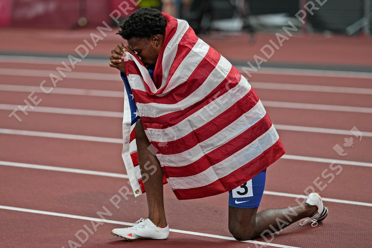 Noah Lyles, of the United States, reacts after his third place finish in the final of the men's 200-meters at the 2020 Summer Olympics, Wednesday, Aug. 4, 2021, in Tokyo. (AP Photo/David J. Phillip)