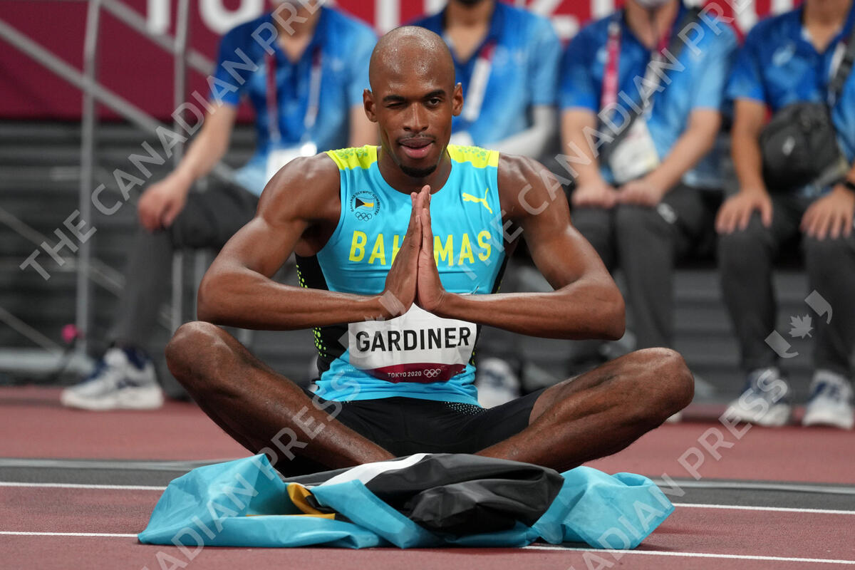 Steven Gardiner, of the Bahamas, reacts after winning the final of the men's 400-meters at the 2020 Summer Olympics, Thursday, Aug. 5, 2021, in Tokyo. (AP Photo/Matthias Schrader)