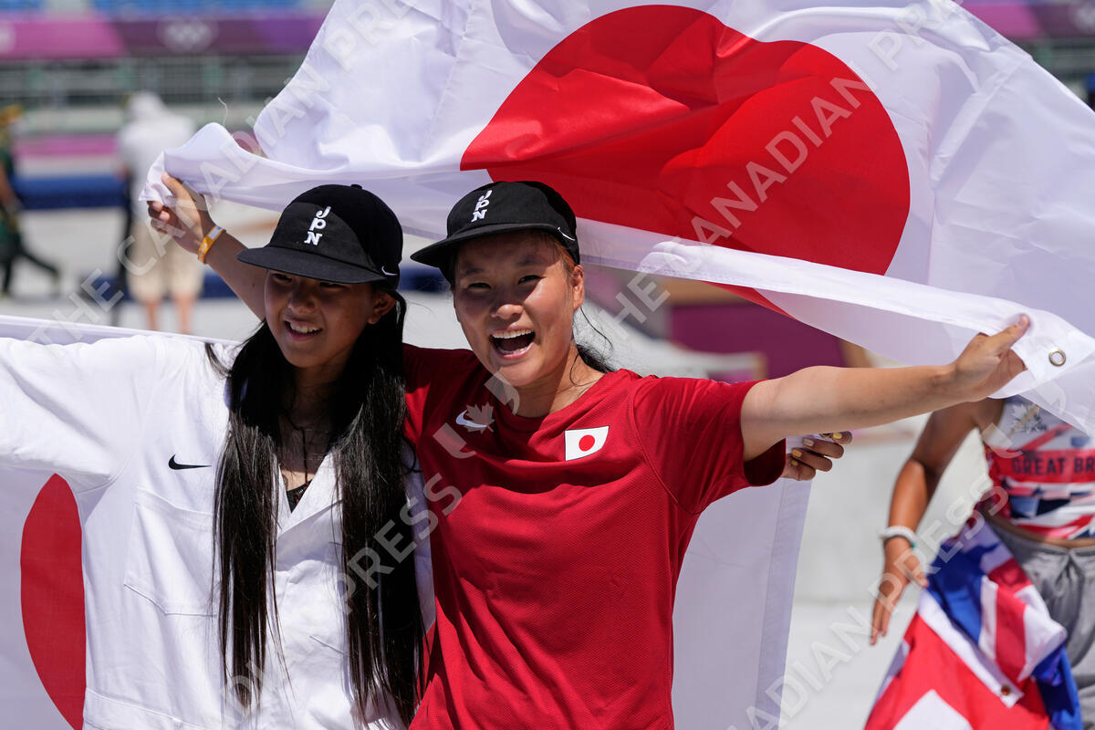 Gold medal winner Sakura Yosozumi, right, and silver medalist Kokona Hiraki, both of Japan, celebrate after the women's park skateboarding finals at the 2020 Summer Olympics, Wednesday, Aug. 4, 2021, in Tokyo, Japan. (AP Photo/Ben Curtis)