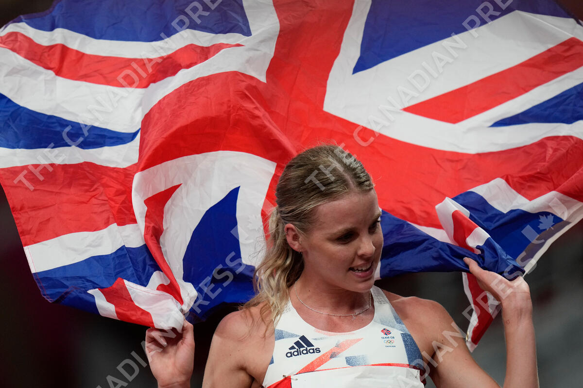 Keely Hodgkinson, of Britain, celebrates after her second place finish in the final of the women's 800-meters at the 2020 Summer Olympics, Tuesday, Aug. 3, 2021, in Tokyo. (AP Photo/Petr David Josek)