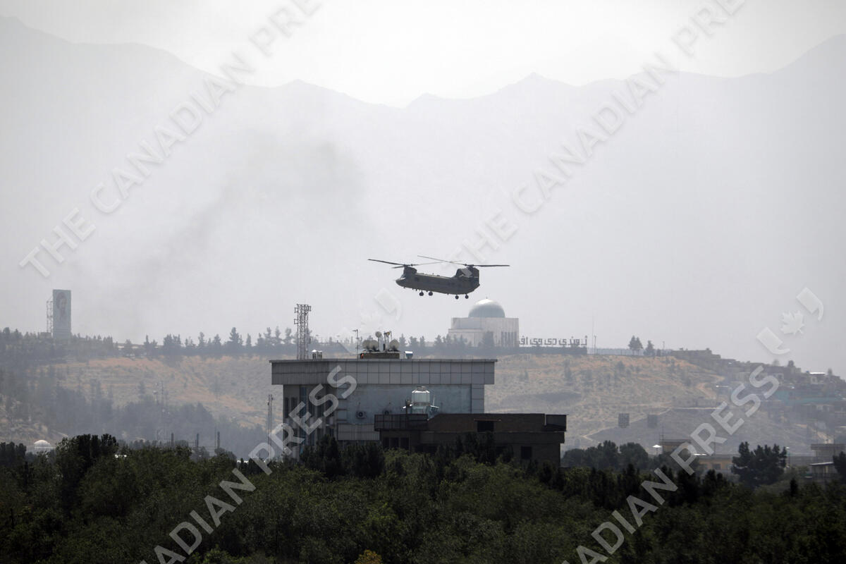 ADVANCE FOR PUBLICATION ON FRIDAY, SEPT. 3, AND THEREAFTER - FILE - In this Sunday, Aug. 15, 2021 file photo, a U.S. Chinook helicopter flies over the U.S. embassy in Kabul, Afghanistan. Helicopters are landing at the embassy as diplomatic vehicles are leaving the compound amid the Taliban advance on the Afghan capital. (AP Photo/Rahmat Gul, File)