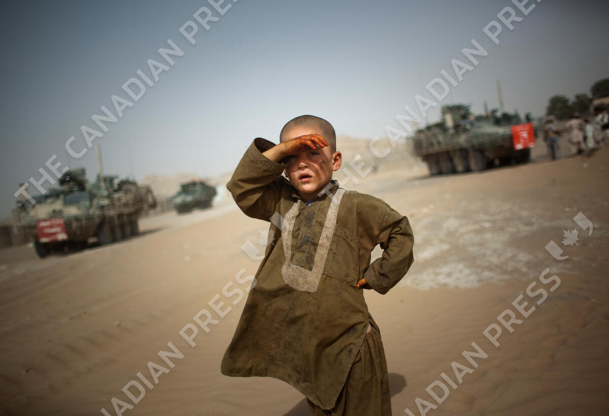 ADVANCE FOR PUBLICATION ON FRIDAY, SEPT. 3, AND THEREAFTER - FILE - In this Aug. 6, 2009 file photo, a child looks on as military vehicles of 5th Striker Brigades drive past his village on the outskirts of Spin Boldak, about 100 kilometers (63 miles) southeast of Kandahar, Afghanistan. (AP Photo/Emilio Morenatti, File)