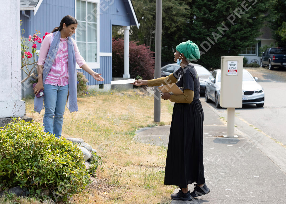 ADVANCE FOR PUBLICATION ON TUESDAY, SEPT. 7, AND THEREAFTER - Shukri Olow, right, a Muslim woman who is running for King County Council District 5, hands a campaign flier to Tayyabah Ahmed, left, Saturday, Aug. 14, 2021, as she campaigns in Renton, Wash., south of Seattle. Muslim Americans in their 20s and 30s who grew up amid the aftershocks of the Sept. 11, 2001 terrorist attacks came of age in a world not necessarily attuned to their interests, their happiness and their well-being. Olow says the aftermath of the attacks has helped motivate her to become a community organizer and to run for office in Washington state. (AP Photo/Karen Ducey)