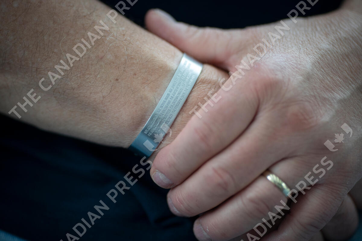 ADVANCE FOR PUBLICATION ON SATURDAY, SEPT. 4, AND THEREAFTER - Retired NYPD Officer Mark DeMarco wears a wristband with the names of the 14 ESU members killed on Sept. 11, 2001, during an interview in his home in the Staten Island borough of New York on Tuesday, Aug. 3, 2021. He worries that the public memory of the attacks is fading, that the passage of time has created a false sense of security. (AP Photo/Wong Maye-E)
