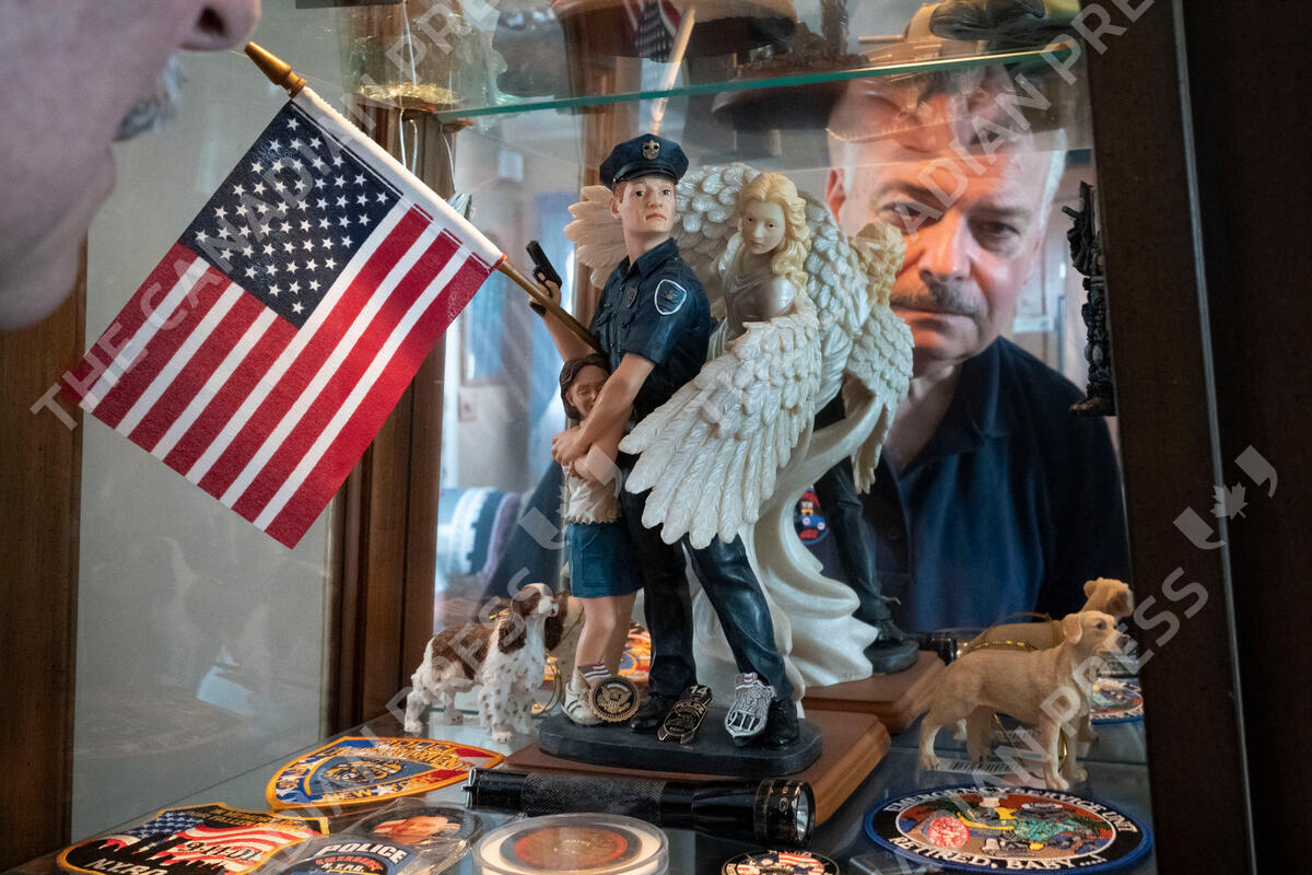 ADVANCE FOR PUBLICATION ON SATURDAY, SEPT. 4, AND THEREAFTER - Retired NYPD Officer Mark DeMarco, is seen in a reflection off a display cabinet where he keeps memorabilia from 9/11 including the small flashlight which he used to help him navigate his way out of the rubble of the fallen skyscrapers, in his home in the Staten Island borough of New York on Tuesday, Aug. 3, 2021. He worries that the public memory of the attacks is fading, that the passage of time has created a false sense of security. "Have fun with life. Don't be afraid," he says. "But be mindful." (AP Photo/Wong Maye-E)