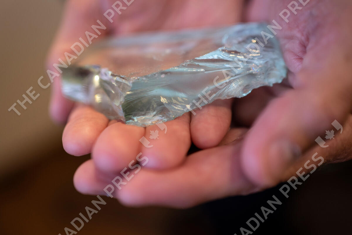 ADVANCE FOR PUBLICATION ON SATURDAY, SEPT. 4, AND THEREAFTER - Retired NYPD Officer Ken Winkler, holds a broken piece of glass that he kept from the fallen World Trade Center skyscrapers, which he keeps in his office on Tuesday, Aug. 3, 2021, in New York. "Somebody once asked me, 'How often do you think about it?' I told him it's easier to count the days when you don't think about it," says Winkler, who now manages Manhattan's cruise ship terminal. (AP Photo/Wong Maye-E)