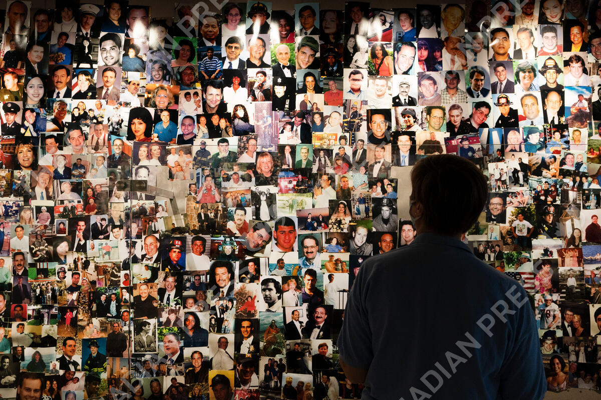 ADVANCE FOR PUBLICATION ON SATURDAY, SEPT. 4, AND THEREAFTER - Désirée Bouchat, a survivor of the 9/11 attacks on the World Trade Center, looks at photos of those who perished, in a display at the 9/11 Tribute Museum, Friday, Aug. 6, 2021, in New York. While Sept. 11 was a day of carnage, it also was a story of survival: Nearly 3,000 people were killed, but an estimated 33,000 or more people evacuated the World Trade Center and Pentagon. (AP Photo/Mark Lennihan)