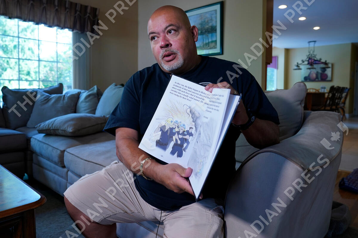 ADVANCE FOR PUBLICATION ON SATURDAY, SEPT. 4, AND THEREAFTER - Will Jimeno, the former Port Authority police officer who was rescued from the rubble of the Sept. 11, 2001 attacks at the World Trader Center after many hours, holds the children's book he wrote, "Immigrant, American, Survivor," that draws on his experience, during an interview at his home in Chester, N.J., Monday, Aug. 2, 2021. (AP Photo/Richard Drew)