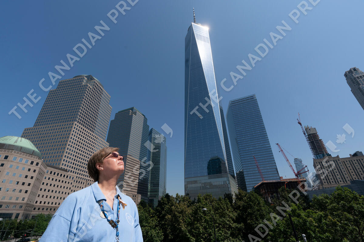 ADVANCE FOR PUBLICATION ON SATURDAY, SEPT. 4, AND THEREAFTER - Désirée Bouchat poses for a photo at the World Trade Center, Friday, Aug. 6, 2021, in New York. At first, people figured the plane crash at the north tower was accidental. There was no immediate evacuation order for the south tower. But James Patrick Berger ushered Bouchat and other Aon Corp. colleagues to the elevators, then turned back to check for more people. (AP Photo/Mark Lennihan)