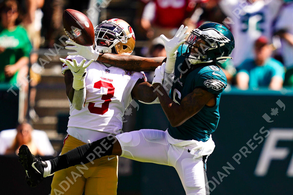 Philadelphia Eagles wide receiver DeVonta Smith (6) fails to catch a pass as San Francisco 49ers strong safety Jaquiski Tartt (3) defends during the first half of an NFL football game Sunday, Sept. 19, 2021, in Philadelphia. (AP Photo/Matt Slocum)
