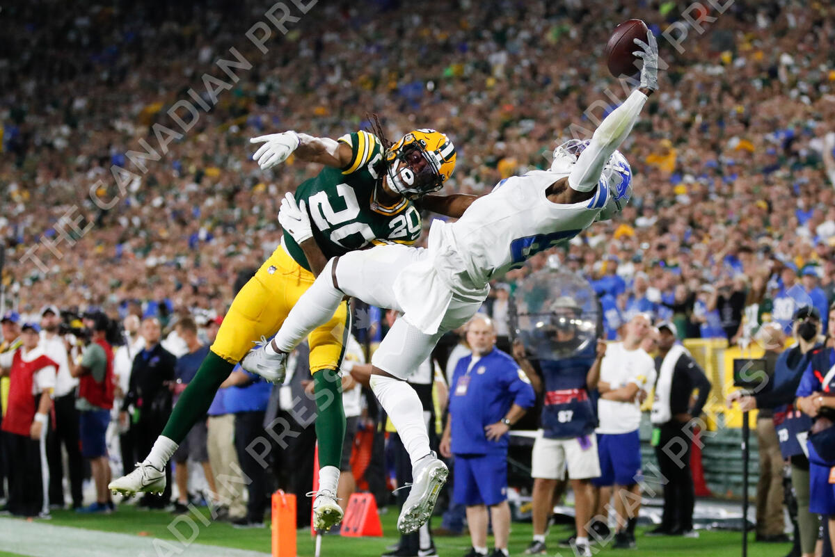Green Bay Packers' Kevin King breaks up a pass intended for Detroit Lions' Quintez Cephus during the first half of an NFL football game Monday, Sept. 20, 2021, in Green Bay, Wis. (AP Photo/Matt Ludtke)