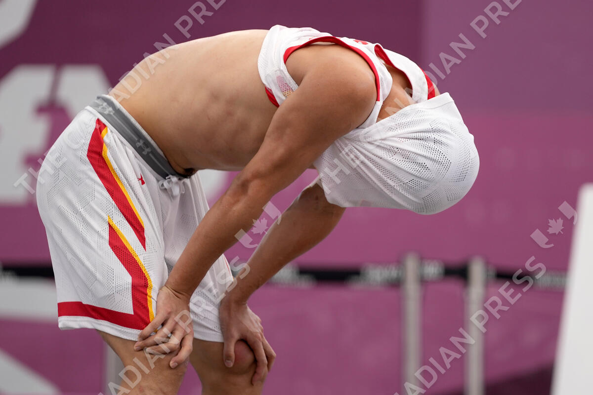 China's Gao Shiyan reacts to his team's loss to Japan during a men's 3-on-3 basketball game at the 2020 Summer Olympics, Tuesday, July 27, 2021, in Tokyo, Japan. (AP Photo/Jeff Roberson)
