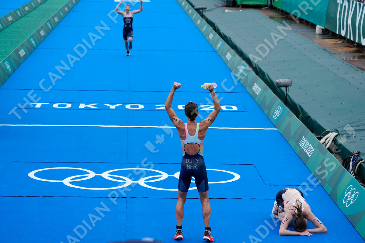 Gold medal winner Flora Duffy, of Bermuda, cheers on bronze medalist Katie Zaferes, of the United States, as she approaches the finish, while silver medalist Georgia Taylor-Brown of Britain collapses on the ground after finishing during the women's individual triathlon competition at the 2020 Summer Olympics, Tuesday, July 27, 2021, in Tokyo, Japan. (AP Photo/Charlie Riedel)(AP Photo/David Goldman)