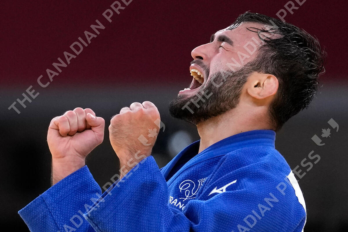 Luka Mkheidze of France reacts after competing against Kim Won-jin of South Korea during their men's -60kg bronze medal judo match at the 2020 Summer Olympics, Saturday, July 24, 2021, in Tokyo, Japan. (AP Photo/Vincent Thian)