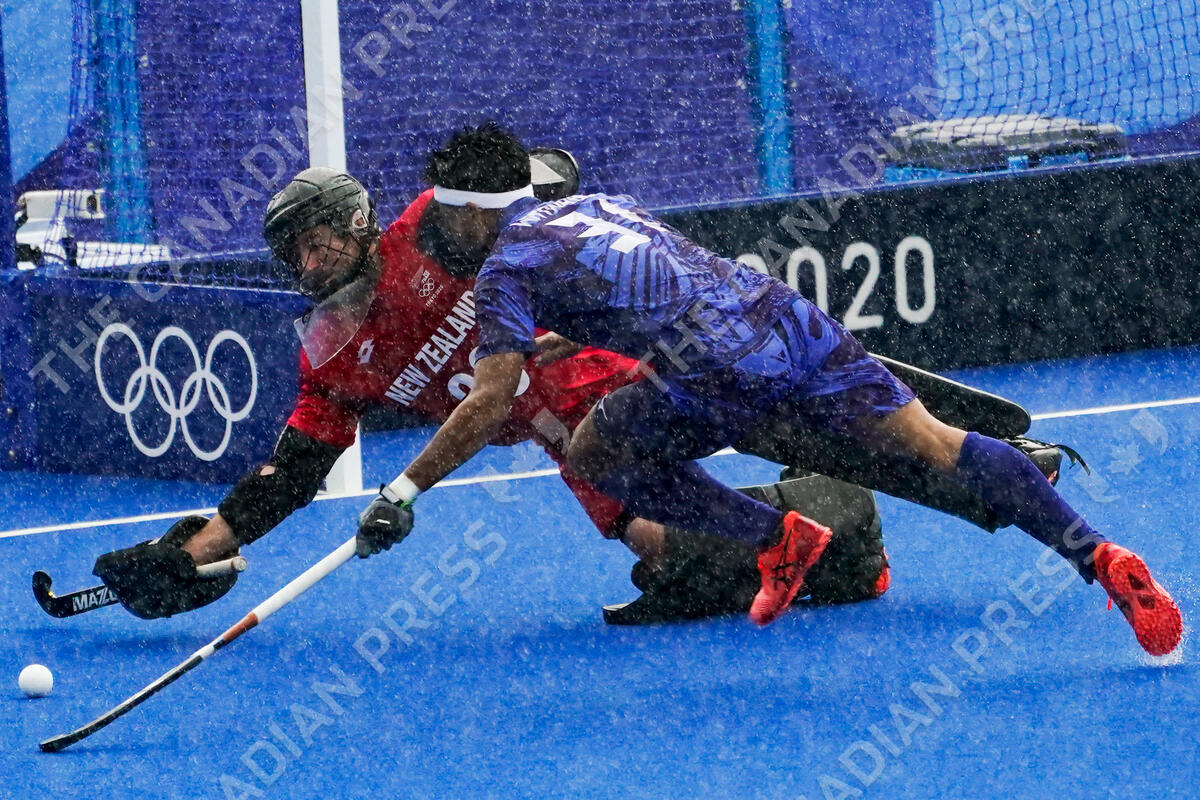 Japan's Kota Watanabe (31) leaps for a loose ball against New Zealand goalkeeper Leon Hayward in a downpour during a men's field hockey match at the 2020 Summer Olympics, Tuesday, July 27, 2021, in Tokyo, Japan. (AP Photo/John Minchillo)