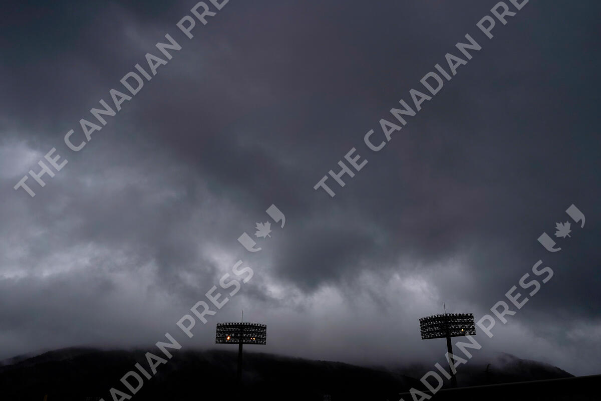 Storm clouds hover over the Fukushima Azuma Baseball Stadium at the 2020 Summer Olympics, Tuesday, July 27, 2021, in Fukushima, Japan. Japan opens the Olympic baseball tournament against the Dominican Republic Wednesday. (AP Photo/Jae C. Hong)