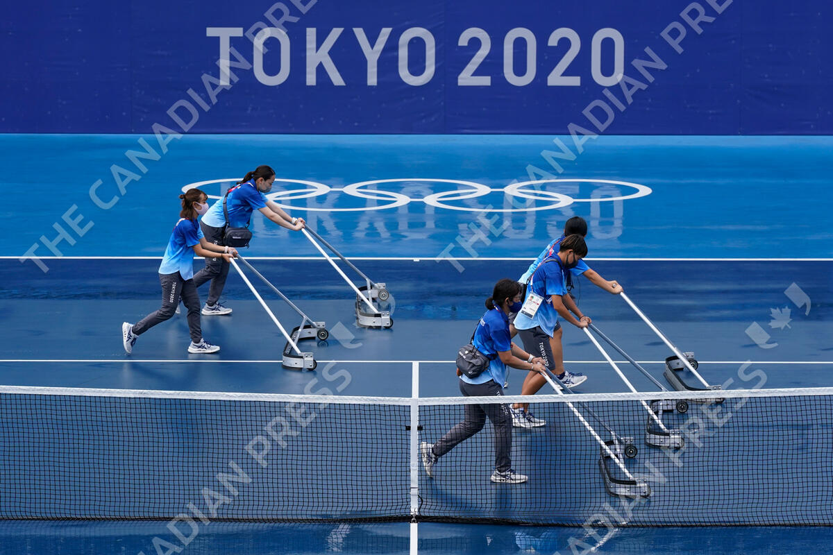 Workers push water off of a court during a rain delay in the tennis competition at the 2020 Summer Olympics, Tuesday, July 27, 2021, in Tokyo, Japan. (AP Photo/Patrick Semansky)